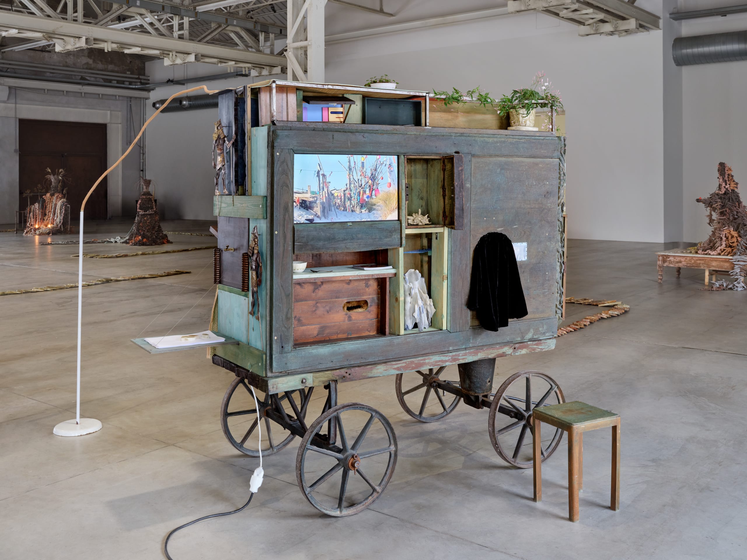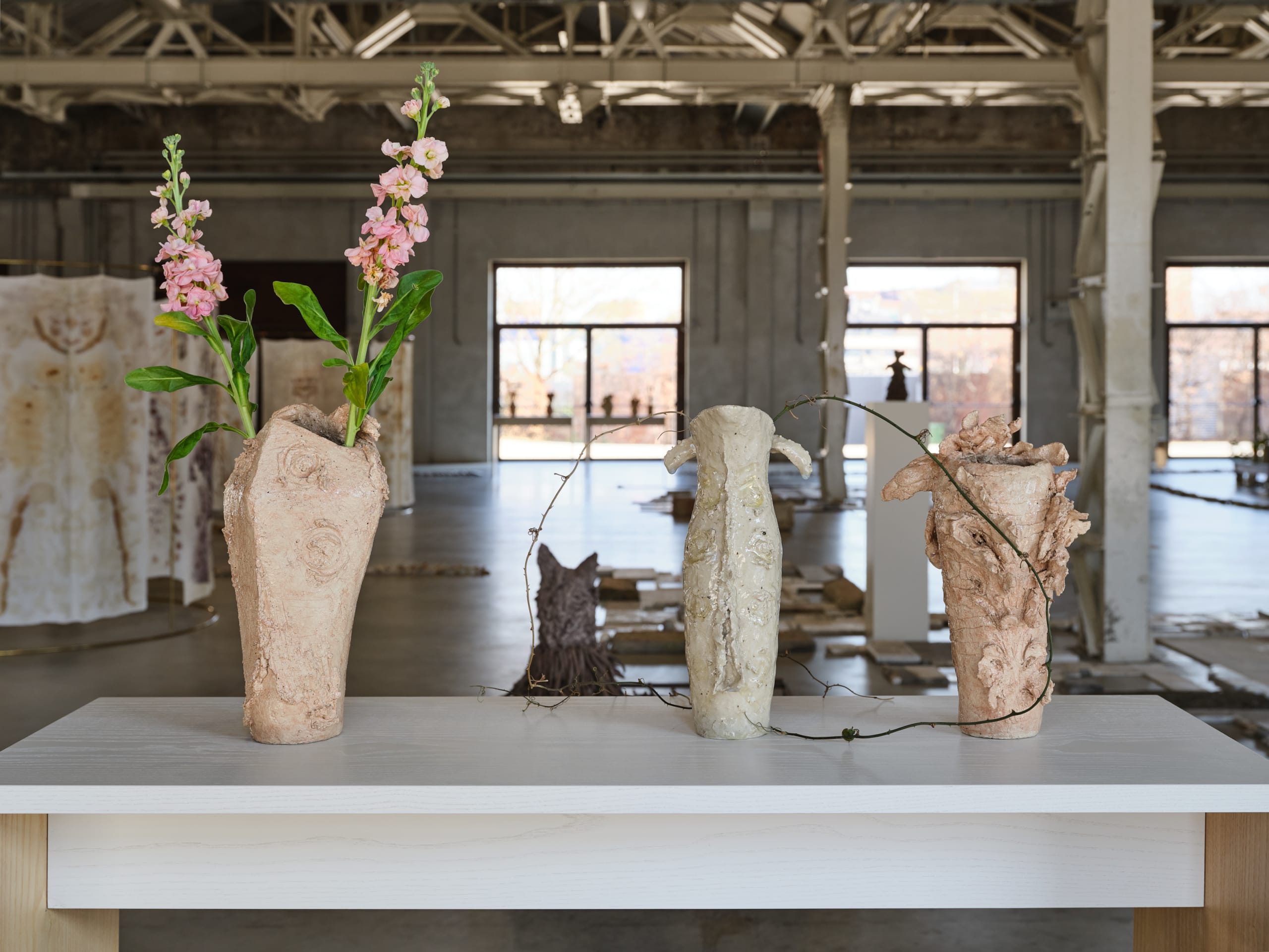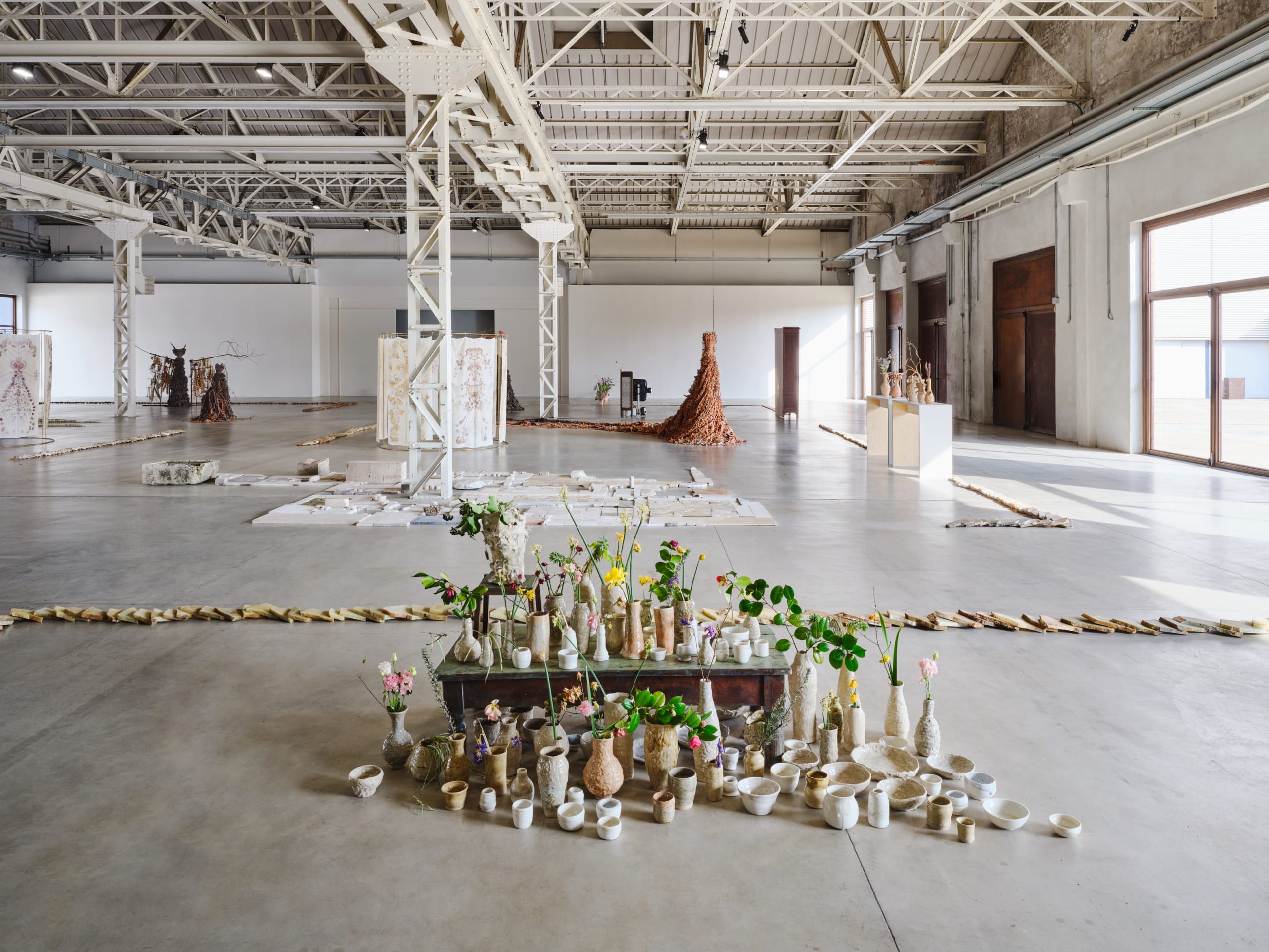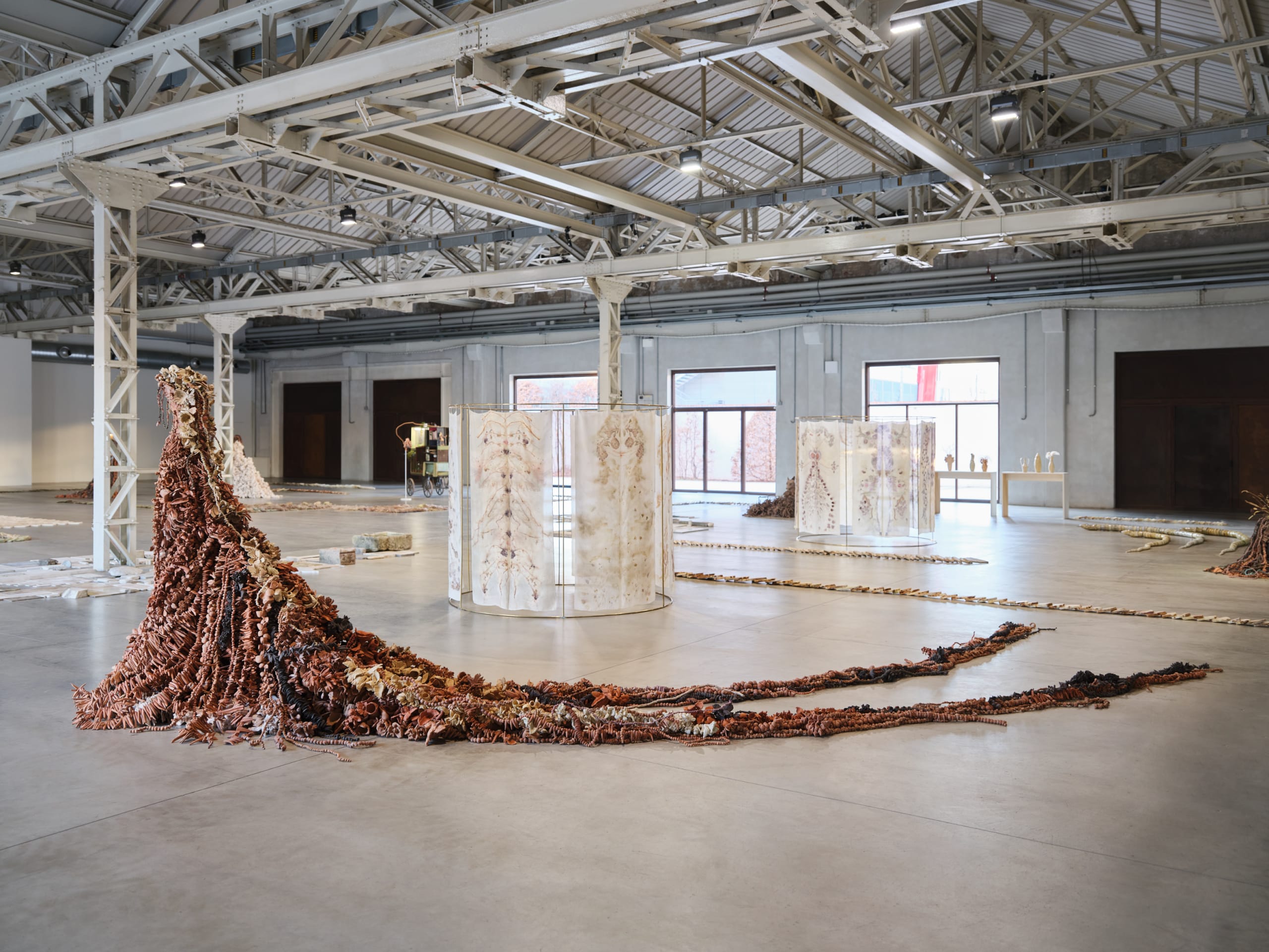 The exhibition at Pirelli HangarBicocca brings together the largest body of works ever presented by Chiara Camoni and, together with a series of new productions, gives life to an architecture of collectivity and memory, whose forms are inspired by the Italian gardens of the late Renaissance and the ancient amphitheaters. The symmetrical and radial design of the floor plan creates corridors and rooms, paths and environments that divide the space into areas where visitors can linger or converse.