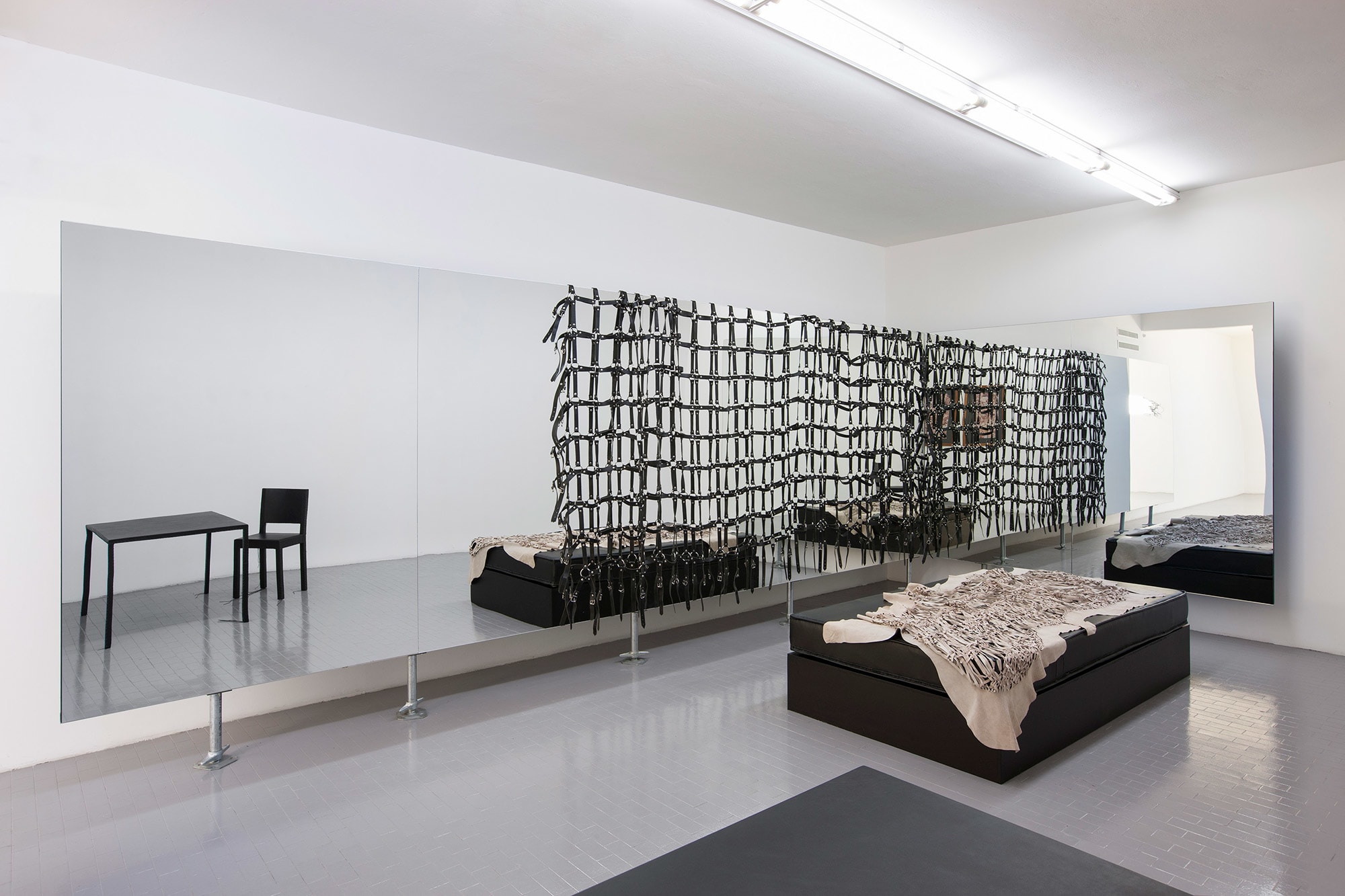 Monica Bonvicini’s practice combines a meticulous attention to form with an equally pressing examination of the social aspect of architecture and public space, as well as how it can be used to construct sexual identity. Her sculptures, installations, photographs and videos question the neutrality of architecture, artistic creation, and power structures.